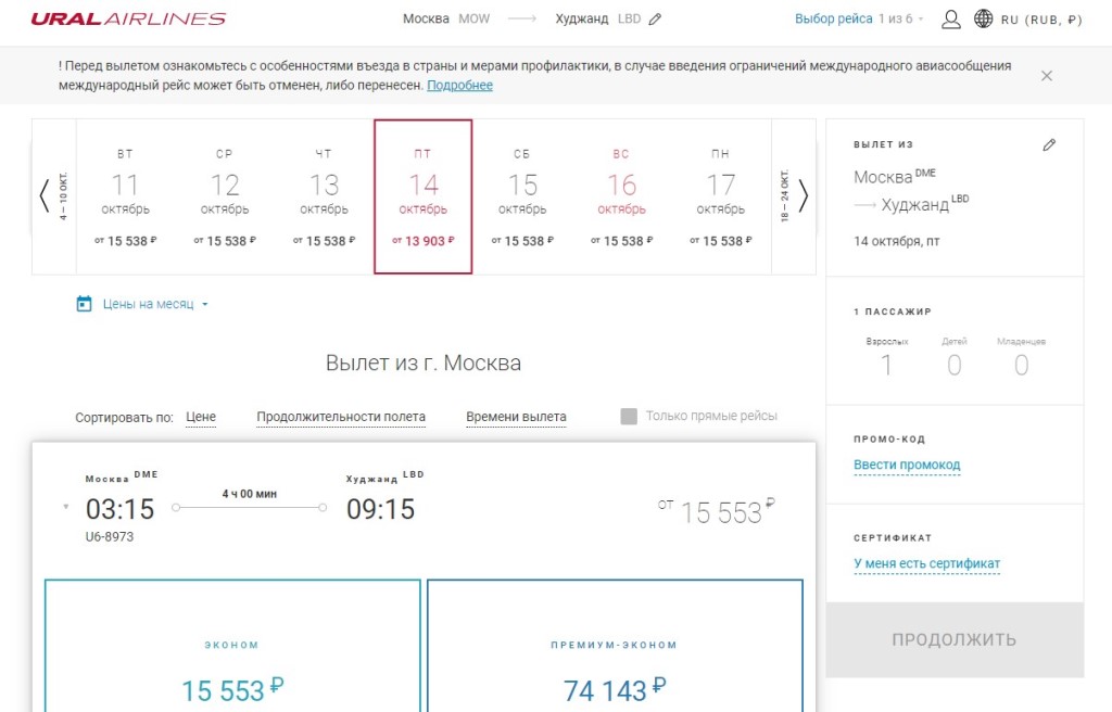 Нархи чиптаҳои ширкати ҳавопаймоии “Уралские авиалиний” низ поин рафтааст. Имрӯз хатсайри Маскав - Душанбе аз 19 026 то 23 661 рубл арзиш дорад. То Хуҷанд рафтан боз ҳам арзонтар аст: аз 13 903 то 15 538 рубл.