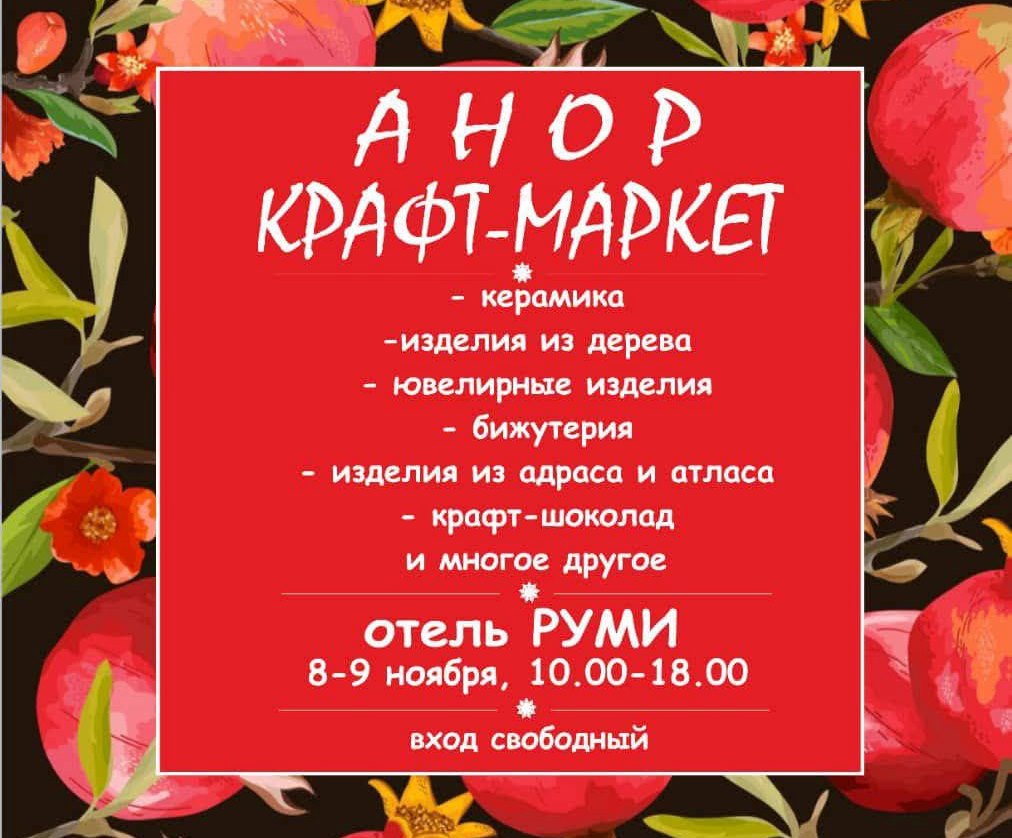 В отеле «Руми» 8-9 ноября пройдёт традиционная выставка-ярмарка ремесленников «Анор крафт-маркет» с участием лучших мастеров из Таджикистана, России, Узбекистана и Афганистана. Тема ярмарки – анор, то есть гранат – почитаемый и обожаемый фрукт во многих уголках мира, в том числе и в Таджикистане. Он вдохновляет и ремесленников, и художников, и это находит выход в их творчестве.