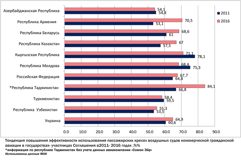 Вместе с этим в большую сторону согласно данным исследования МАК в «Таджик Эйр» увеличилась и эффективность использования пассажирских кресел воздушных судов. Так, за период 2011-2016 годов в «Таджик Эйр» этот показатель увеличился на 6,3%. По этому показателю «Таджик Эйр» опережает авиакомпании Беларуси (+8,9%). За «Таджик Эйр» в рейтинге следуют авиакомпании России (+3,9%), Uzbekistan Airways (Узбекистан) (+3,5%), Air Moldova (Молдова) (+2,6%), авиакомпании Украины (+0,8%) и Азербайджана (+0,5%).