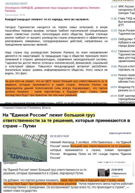 В конце прошлой недели на сайте «АП» был опубликован материал Илхомджона Хамидова, « Почему я голосую за Эмомали Рахмона ?» в котором автор описывает достижение президента Рахмона за годы его правления. Текст получил большое количество просмотров, комментариев и вызвал бурное обсуждение в «таджикских» соцсетях. Между тем, читатели «АП» через некоторое время нашли в этом тексте неуказанные автором цитаты из предвыборного текста президента Украины Виктора Януковича « Украина – для людей! ». В материале Хамидова, внимательные читатели также обнаружили цитаты из текста заявления президента России Путина на XIV съезде партии «Единая Россия».