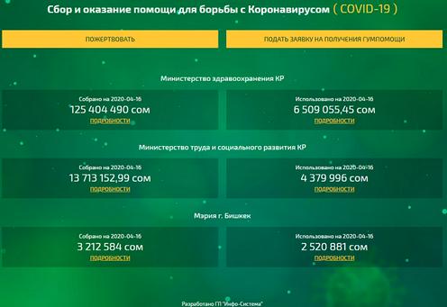 На сайте публикуются сведения о финансах Министерства труда и социального развития, Министерства здравоохранения и мэрии Бишкека. Там можно узнать, сколько денег поступило на специальные счета по борьбе с эпидемией, как они были потрачены, а также какая гуманитарная помощь была оказана и как она распределена. На сайте имеются специальные формы для граждан, желающих пожертвовать деньги или получить гуманитарную помощь.